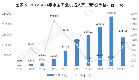 2021年1-5月,我国工业机器人的产量为136405台,与去年同期同比增加73.2%。
