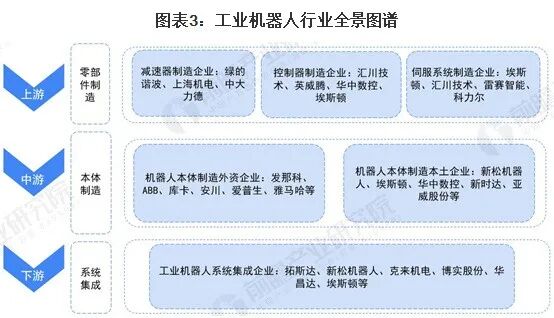 在上游领域,减速机、伺服电机、控制器是工业机器人的三大零部件,国外工业机器人大型企业往往通过掌握关键零部件技术打造核心竞争力。近年来,随着国内技术的提升,自主品牌逐渐进入相关领域,在减速器制造领域,代表企业有绿的谐波、上海机电、中大力德等;在控制器制造领域,代表企业有绿的谐波、上海机电、中大力德;在系统集成领域,代表企业有埃斯顿、汇川技术、雷赛智能、科力尔等。