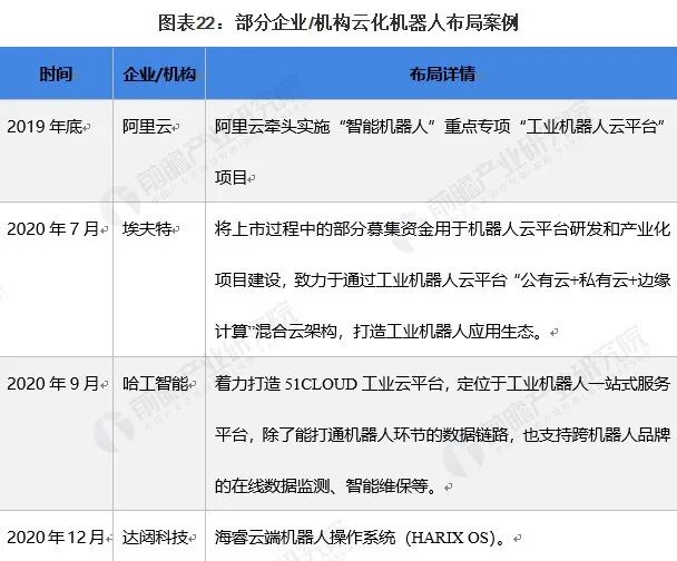 2017年时华为、Skymind、中国移动、达闼科技、GTI、软银共同推出《云化机器人白皮书(GTI 5G and Cloud Robotics White Paper)》,其中指出云化机器人即位于数据中心的“大脑”利用人工智能和其他软件技术,借助本地机载控制器对传统机器人下达指令,云机器人将打来新的价值链、技术、架构、体验和新商业模式。未来,随着5G、AI、云计算等技术的发展成熟,云化机器人及工业机器人云平台或将成为新一轮发展热点。